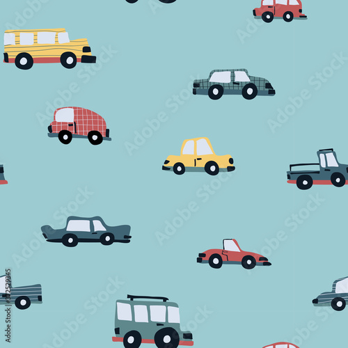 Cars seamless pattern design hand-drawn childish style - fabric, wrapping, textile, wallpaper, apparel design for kids.