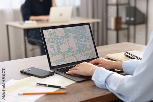 Cartographer working with cadastral map on laptop at wooden table in office, closeup