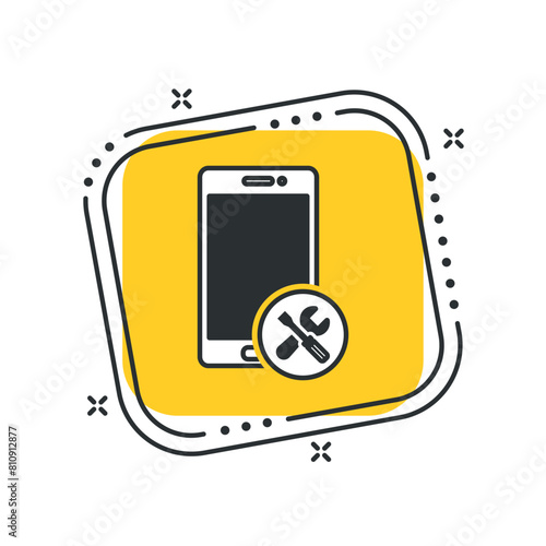 Cartoon phone repair icon vector illustration. Spanner, screwdriver on isolated yellow square background. Service sign concept.