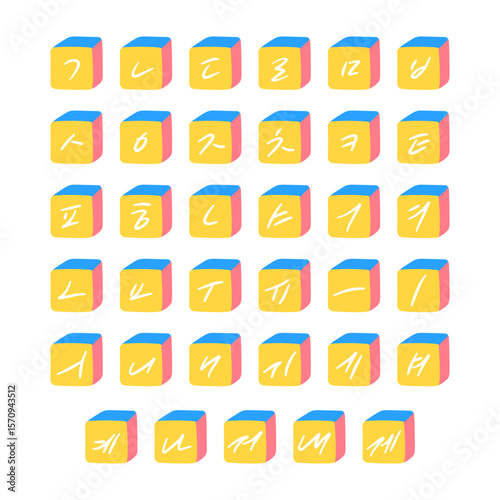 Cartoon 3D cute cube font for preschool kids. Vector colorful korean alphabet set.