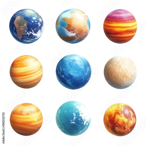 Cartoon 3D Planets Set, Fictional Worlds, Isolated, on transparent background Digital Art and Colorful Space