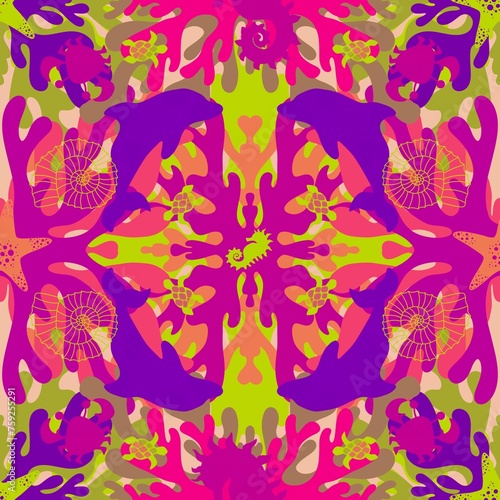 Cartoon animals seamless starfish and turtle and shell and crabs and octopus pattern for fabrics