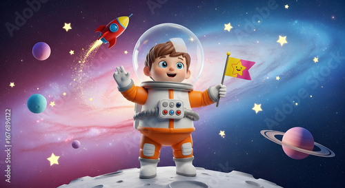 Cartoon Astronaut Boy on Moon with Rocket and Starry Galaxy Background