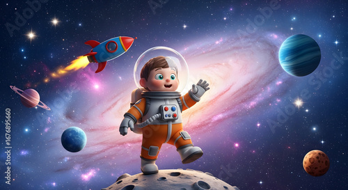 Cartoon Astronaut on Moon with Rocket and Planets in Space