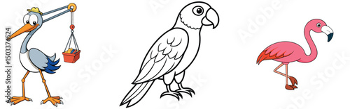 Cartoon bird collection featuring a crane parrot and flamingo on a white background