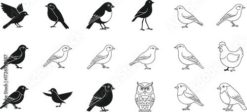 Cartoon bird silhouette set, owl, chicken, songbird vector icons, black animal illustration, playful avian character design elements