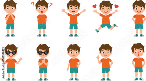 Cartoon boy character, emotional expressions, happy child, sad kid, thinking boy, vector illustration, character animation, cute emotions, children’s mood set, emoji style, kids reaction pack