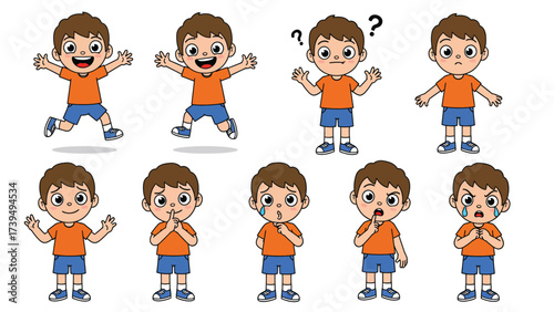 Cartoon Boy Character Expressing Diverse Emotions and Actions Set