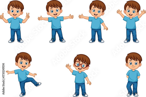 Cartoon boy character in different poses with happy expressions, cute kid illustration, children clipart, smiling child design, playful vector