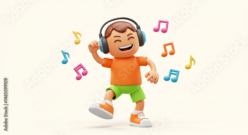 Cartoon boy listening to music with headphones and dancing with musical notes animation illustration on transparent background