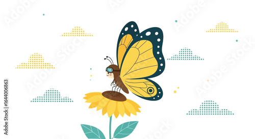 Cartoon butterfly with goggles resting on a flower against a background of clouds creating a whimsical and charming vector illustration