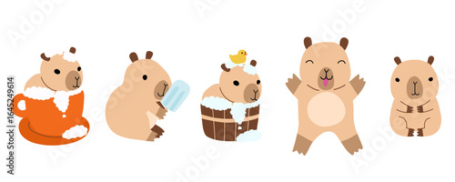 Cartoon capybara in tub, morning capybara in cup of cappuccino, summer cute capybara with ice cream set. Kawaii pet animal for card, decoration, print. Stock vector illustration isolated on white