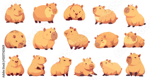 Cartoon capybaras. Funny animal characters in various poses sitting sleeping, pet zoo capybara mascot set vector illustration