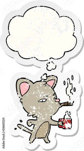 cartoon cat with coffee and cigar and thought bubble as a distressed worn sticker
