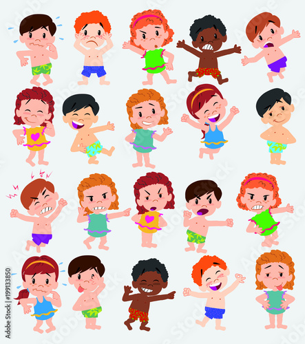 Cartoon character boys and girls in a swimsuit. Set with different postures, attitudes and poses, doing different activities. Vector illustrations.