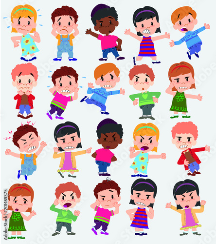 Cartoon character boys and girls. Set with different postures, attitudes and poses, always in negative attitude, doing different activities. Vector illustrations.