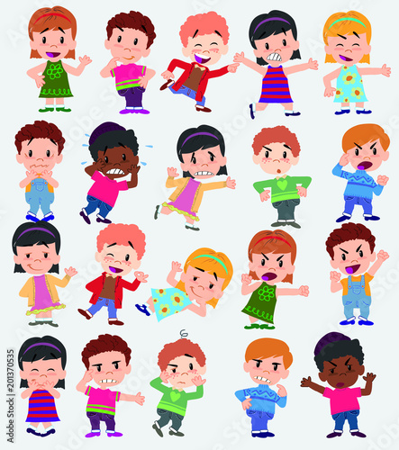 Cartoon character boys and girls. Set with different postures, attitudes and poses, doing different activities. Vector illustrations.