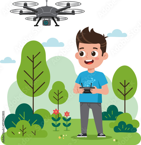 Cartoon Character Controlling a Drone in the Park Flat Illustration