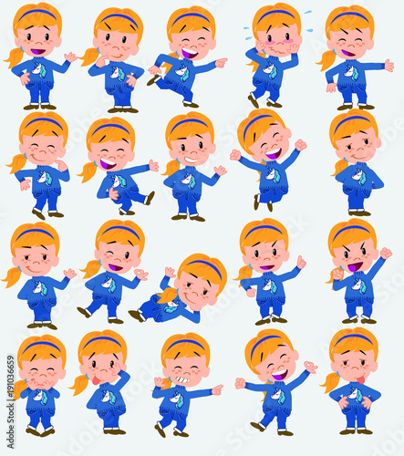 Cartoon character girl. Set with different postures, attitudes and poses, always in positive attitude, doing different activities in vector vector illustrations.