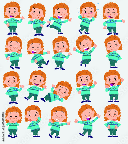 Cartoon character girl with sweater. Set with different postures, attitudes and poses, always in positive attitude, doing different activities in vector vector illustrations.