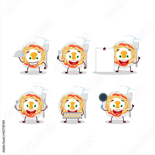 Cartoon character of noodles with various chef emoticons