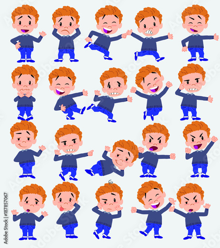 Cartoon character white boy in jeans. Set with different postures, attitudes and poses, doing different activities in isolated vector illustrations.