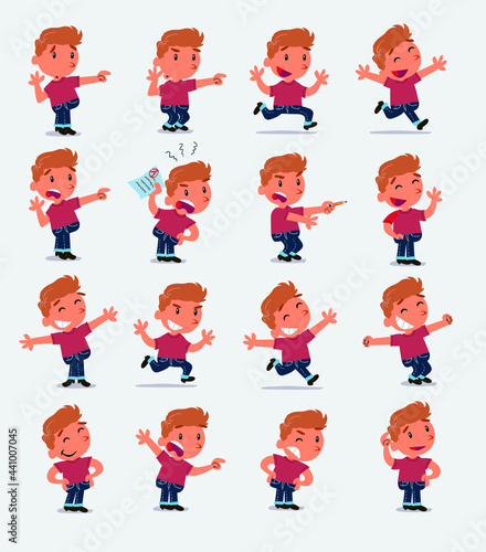Cartoon character white little boy. Set with different postures, attitudes and poses, doing different activities in isolated vector illustrations