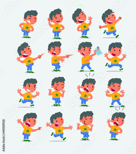Cartoon character white little boy. Set with different postures, attitudes and poses, doing different activities in isolated vector illustrations