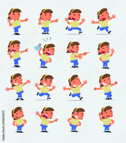 Cartoon character white little girl. Set with different postures, attitudes and poses, doing different activities in isolated vector illustrations