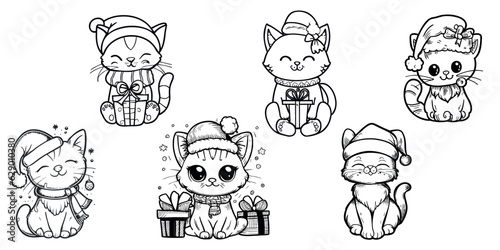 Cartoon Christmas cat, drawing for coloring, black outline on a transparent background.