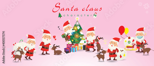 Cartoon Christmas illustrations set. Funny happy Santa Claus and raindeer, bag with presents, Sleigh and christmas tree, waving and greeting, For Christmas cards, banners, tags and labels.