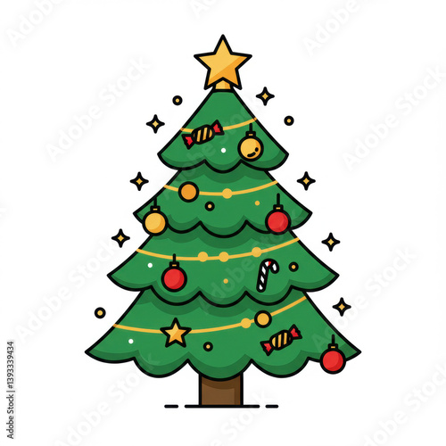 Cartoon Christmas tree decorated with ornaments and candy canes