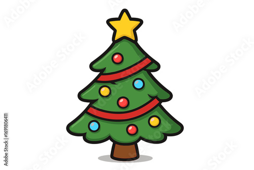 Cartoon Christmas tree vector illustration. Cute decorated Xmas pine with star and colorful balls. Festive holiday icon for winter celebration, greeting card, or seasonal design.