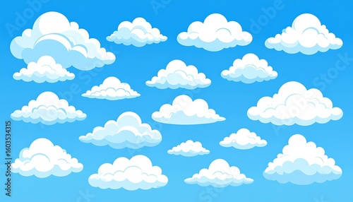 Cartoon clouds against a blue sky. A collection of various cloud shapes