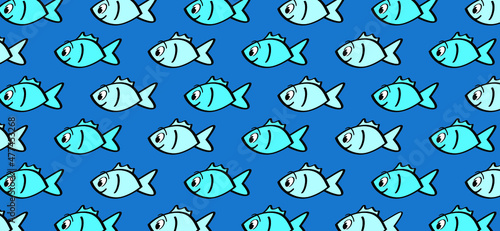 cartoon, comic fish bowl or aquarium. Goldfish in a bowl. Fishbones or fishbone sign. Swims underwater. Vector swimming in the sea pattern, blue background banner, ocean icon or pictogram.