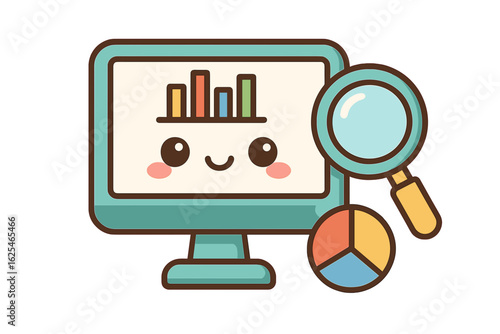 Cartoon computer with smiley face and graph alongside magnifying glass business monitoring system