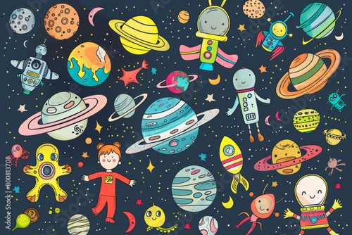 Cartoon cute doodles of kids embarking on a journey through outer space, visiting distant planets and making friends with alien creatures, Generative AI
