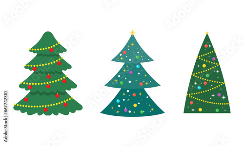 Cartoon Decorated Christmas Trees Collection with Balls, Stars, and Garland Fir Trees Illustration