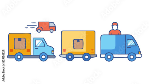 Cartoon delivery trucks with packages and driver in blue orange and yellow color scheme illustration