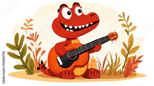 Cartoon Dinosaur Playing Guitar in Colorful Natural Setting