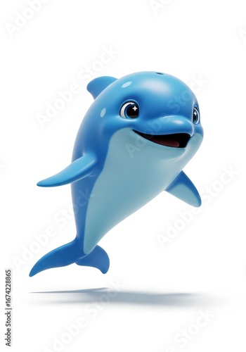 Cartoon dolphin, blue, cheerfully jumping against a white background, rendered with smooth surfaces and soft lighting