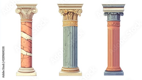 Cartoon drawings of columns, including Greek temple columns and Roman architecture elements. These ancient pillars are decorated with ornaments and are used in modern architecture today.