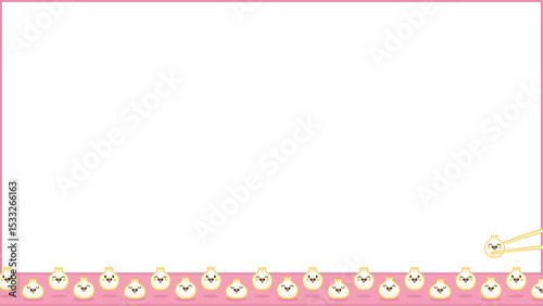 Cartoon dumplings are lining transparent background with pink border, chopsticks lifting one