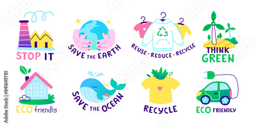 Cartoon ecological sticker set. Vector bright environmental conservation sticker collection.