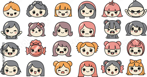 Cartoon face collection with diverse expressions in colorful vector style