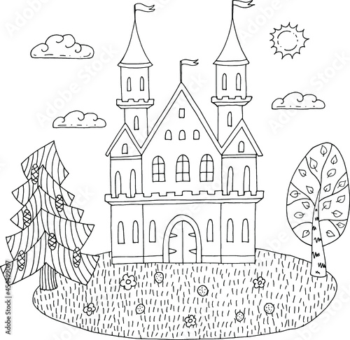 Cartoon fairy-tale castle doodle. Vector children's illustration with a magic castle on the grass with trees, sun and clouds. For coloring