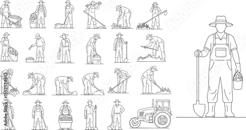 Cartoon farmer character in multiple poses, line art style, farming activity illustrations, agriculture tools, rural life vector collection