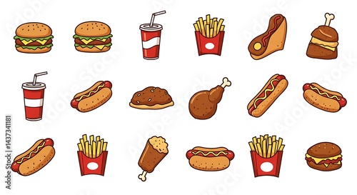 Cartoon Fast Food Illustration Featuring Burgers Hot Dogs Fries and Drinks