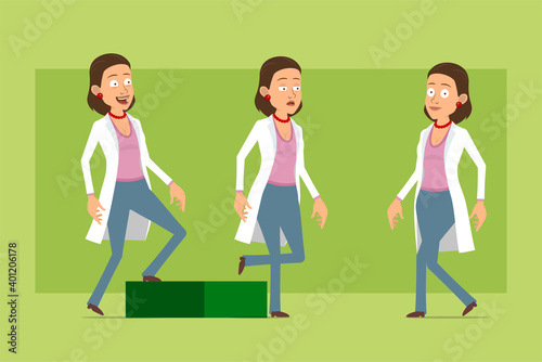 Cartoon flat funny doctor woman character in white uniform. Successful tired girl walking up to his goal. Ready for animation. Isolated on green background. Vector set.
