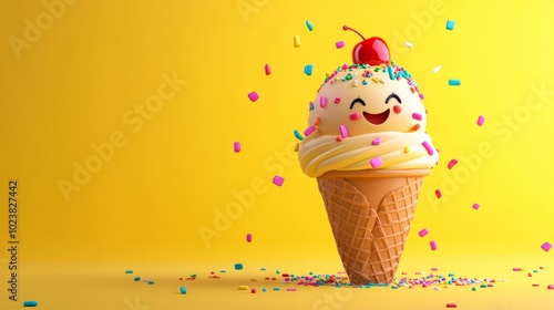 Cartoon Giant Ice Cream Cone with Cherry, Space for Copy